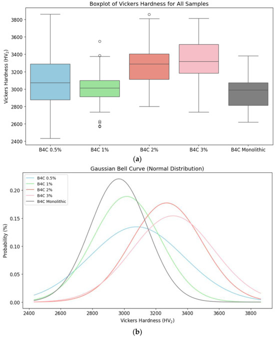 Vickers hardness for B4C composites and monolithic sample comparison: (a) distribution of Vickers hardness data through its quartiles; (b) probability distribution of the hardness values.
