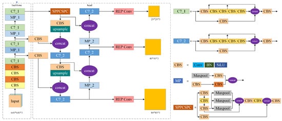 The structure diagram of YOLOv7 is shown in Figure 1. The YOLOv7 network is mainly composed of two parts: the backbone and head. The YOLOv7 backbone employs a C7_1-MP-ELAN architecture to efficiently aggregate multi-scale features: the ELAN module parallelizes convolutional branches and concatenates outputs to balance depth and computational efficiency while deepening the network’s representational capacity without significantly increasing complexity—its multi-branch feature concatenation provides rich information for subsequent layers to learn complex image patterns; MP modules use max pooling to maintain channel consistency, downsizing feature maps by selecting maximum values in pooling windows, reducing spatial dimensions, retaining prominent features, and enhancing robustness against small input translations/distortions. Additionally, the parallel structure allows independent processing of different feature levels, cutting redundant computations to boost efficiency.