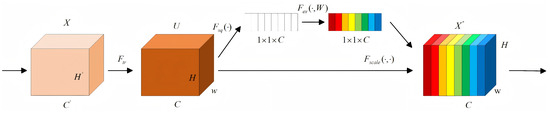Finally, the squeeze result is input into , which consists of a ReLU activation function, two fully connected layers, and a Sigmoid function, to obtain the importance of each channel. Finally, different weights are assigned to each channel through the excitation module to capture the interdependence between channels. The calculation process is summarized as: