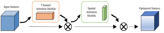 where x is the input feature map, and are the channel attention module and spatial attention module, respectively, denotes two-by-two weighting (which is the feature map optimized by the channel attention mechanism), and is the feature map optimized by the CBAM attention mechanism.