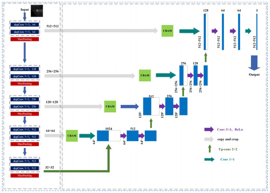 The improved U-Net model framework is shown in Figure 5, where the CBAM attention mechanism module is added before the jumps are connected to the decoder, and the original convolution kernel is replaced by a depth-separable convolution module so that the model pays attention to the important detail information in the image, especially the texture, shape, and boundaries of the crop diseases, and the low-level and high-level semantic information captured in the encoder portion of the U-Net model is better fused with the features in the decoder so that more original feature information can be retained after upsampling and ultimately the accurate and reliable segmentation of the melting pool contour boundaries is realized. The low-level and high-level semantic information captured by the encoder part of the U-Net model can be better fused with the features in the decoder so that the upsampled image can retain more original feature information and ultimately realize the accurate and reliable segmentation of the contour boundary of the crop diseases.