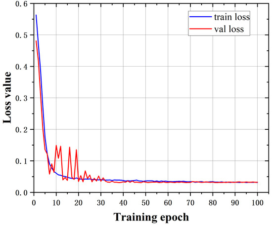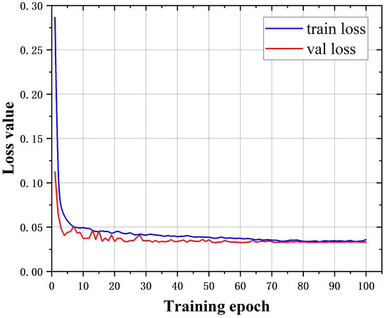 In convergence analysis, the baseline U-Net exhibited slow and unstable convergence, requiring 300 epochs to stabilize at a plateau loss of 0.12 ± 0.015, as shown in Figure 7; its loss reduction rate was just 0.0004 per epoch, accompanied by significant early-training fluctuations that indicated challenges in capturing complex spatial–spectral patterns. In contrast, the improved U-Net achieved rapid and stable convergence, reaching a loss of 0.02 within 100 epochs and stabilizing at 0.008 ± 0.002 after 150 epochs, as shown in Figure 8. This represented a 93% loss reduction compared to the baseline at the same training stage, with a normalized loss reduction rate of 0.0018 per epoch—4.5 times faster than the baseline—highlighting the efficiency gains from architectural modifications.