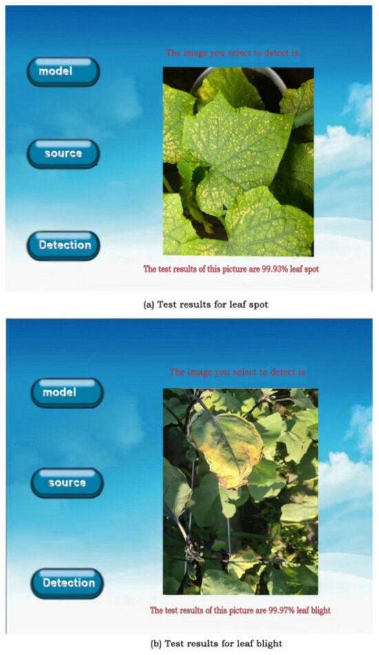 Experiments are carried out in different areas for rice, corn, wheat, and other crops. A user interface was developed to visualize the results for better application. Images of crops such as cucumber and maize were recognized using the designed image recognition method. One pair of cucumber leaf spot disease images was selected for detection and the results showed that the probability of the image being leaf spot disease was 99.93%, as shown in Figure 10a. Then, one pair of cucumber leaf blight images is selected for detection and the result shows that the probability of it being leaf blight is 99.97%, as shown in Figure 10b.