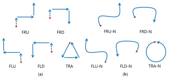 The movements were labeled using alphabetical notations, where “F” denotes a forward movement, “R” and “L” indicate rightward and leftward movements, and “U” and “D” represent upward and downward movements. The target movement set included four fundamental patterns (FRU, FRD, FLU, FLD) along with a triangular movement pattern (TRA) (