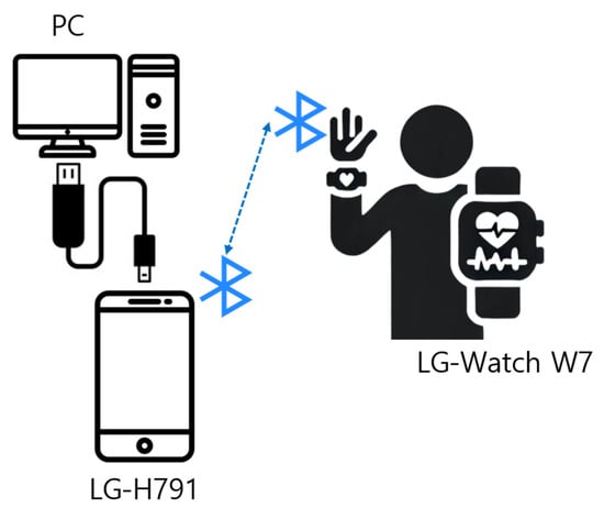 The experimental setup consisted of an LG Watch W7 smartwatch (LG Electronics, Seoul, Republic of Korea), a Nexus 5X smartphone (LG Electronics, Seoul, Republic of Korea), and a PC. Data collection was conducted using Android Studio Arctic Fox (