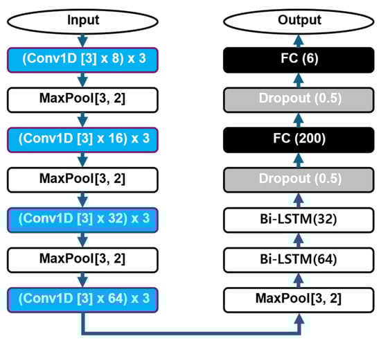 Figure 3. The proposed model is based on a combination of convolutional neural networks (CNN) and bidirectional long short-term memory (Bi-LSTM) layers, which are well-suited for analyzing time-series data. The network architecture comprises four convolutional blocks, where each block consists of three one-dimensional (1D) convolutional layers followed by a max-pooling layer. The convolutional layers in each block have a kernel size of 3, with the number of filters progressively increasing to 8, 16, 32, and 64 across the four blocks. Each convolutional block is followed by a max-pooling layer that applies a pooling size of 3 with a stride of 2, which progressively reduces the dimensionality of the feature maps.