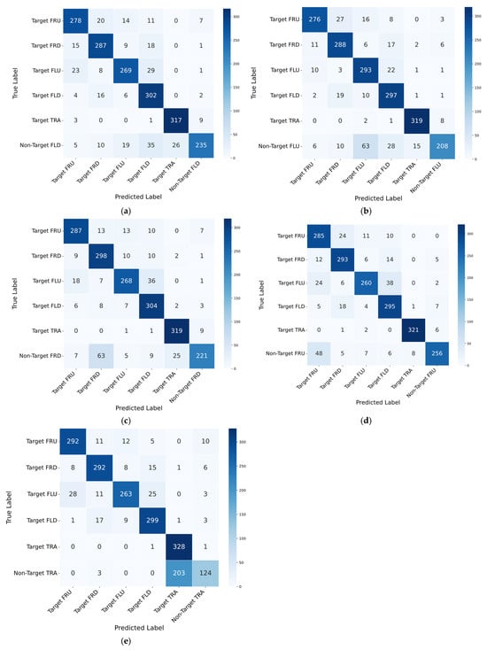To further evaluate the classification performance of the proposed model, confusion matrices were analyzed across the five different experimental settings. Each setting was validated ten times (