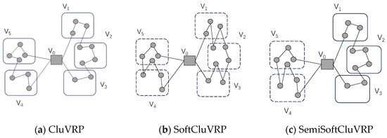 Figure 1 provides a schematic diagram of feasible solutions for the CluVRP, SoftCluVRP, and SemiSoftCluVRP, where the number of customers is 16, and all the customers are divided into five clusters: V1, V2, V3, V4, and V5. Furthermore, in the SemiSoftCluVRP, V1, V2, and V3 are hard clusters, while V4 and V5 are soft clusters. In the figure, to more intuitively distinguish between hard clusters and soft clusters, we use solid-line rectangular boxes to represent hard clusters and dashed-line rectangular boxes to represent soft clusters.