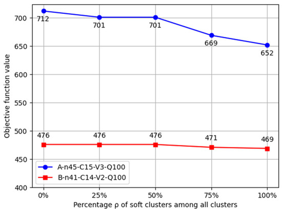 To analyze the impact of the hard–soft attributes of clusters on the experimental results, we conducted a sensitivity analysis on the proportion of hard–soft clusters among all clusters. Let ρ denote the percentage of soft clusters among all clusters. The values of ρ are set to 0%, 25%, 50%, 75%, and 100%, respectively. It is noted that when ρ takes the values of 0% and 100%, the corresponding instances degenerate into CluVRP and SoftCluVRP instances, respectively. We selected one test instance of each type A and B for experimentation. The experimental results are shown in Figure 3.