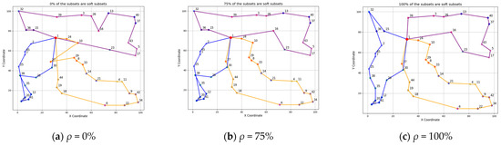 By synthesizing the experimental results of the above two instances, it can be seen that as ρ gradually increases, the objective value generally shows a downward trend, and the extent of the decrease is related to the type of the instance. In Figure 4, we present the representation of the solutions of the instance A-n45-C15-V3-Q100 when ρ = 0%, 75%, and 100%. Here, the red solid circle represents the depot, while other solid circles of the same color represent customers from the same cluster, and the solid lines of the same color constitute the route of the same vehicle. The figure more clearly illustrates the changes in vehicle routes in the corresponding solutions after the clusters are relaxed from hard to soft.