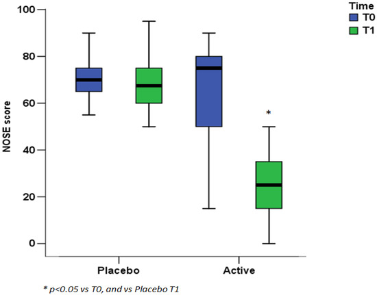 The primary outcome, represented by the total score of the I-NOSE questionnaire, is illustrated in Figure 1. At baseline (T0), both study groups demonstrated similar NOSE scores, reflecting comparable severity of nasal obstruction. However, after 5 days of treatment (T1), the NOSE scores were significantly lower in the group treated with the active product compared to the placebo group. Specifically, at T1 the mean NOSE score was 69.2 (95% CI: 64.8–73.5) in the placebo group and 26.7 (95% CI: 20.5–32.8) in the active treatment group, confirming a marked improvement in nasal obstruction symptoms. Additionally, a statistically significant reduction in NOSE scores was observed within the active group when comparing T0 to T1.