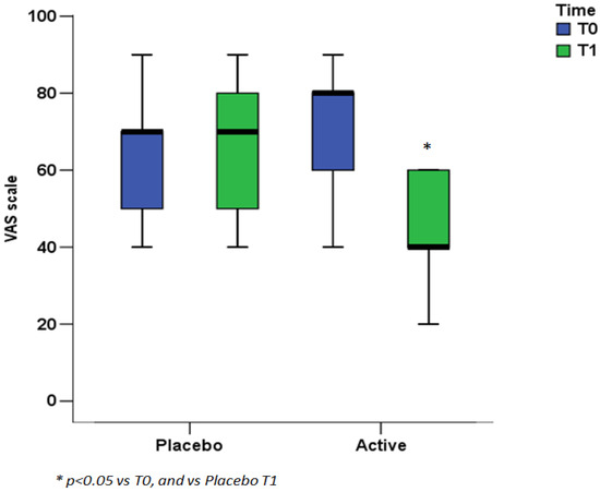 The secondary outcomes, assessed using the VAS scale, are presented in Figure 2. At enrollment, the two study groups had comparable VAS scores, indicating similar perceptions of nasal obstruction. After 5 days of treatment (T1), a significant reduction in VAS scores was observed in the active group, reflecting a notable improvement in the subjective sensation of nasal obstruction. At T1, the mean VAS score was 64.3 (95% CI: 58.4–70.3) in the placebo group and 40.0 (95% CI: 33.7–46.3) in the active treatment group, further supporting the efficacy of the active product in alleviating nasal symptoms. Statistically significant differences were noted between the groups at T1 and between T0 and T1 within the active group.
