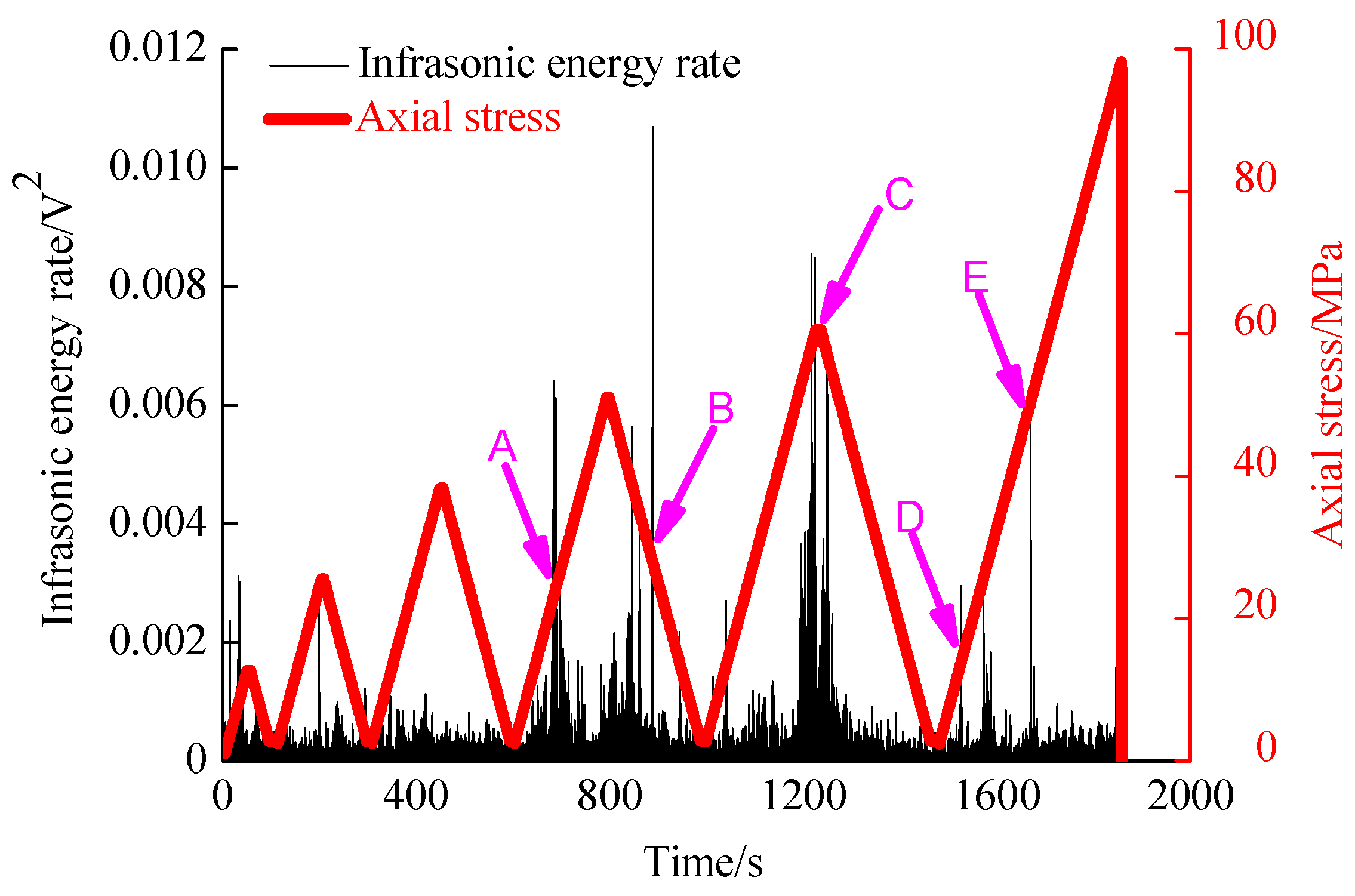 2, which is obviously increased, indicating that the internal fracture of the rock changes significantly with the increase in the stress. The variation in infrasonic energy rate is most obvious in the high-stress stage, such as at point B of the fifth cyclic loading stage, where the infrasonic energy rate is 0.0245 V