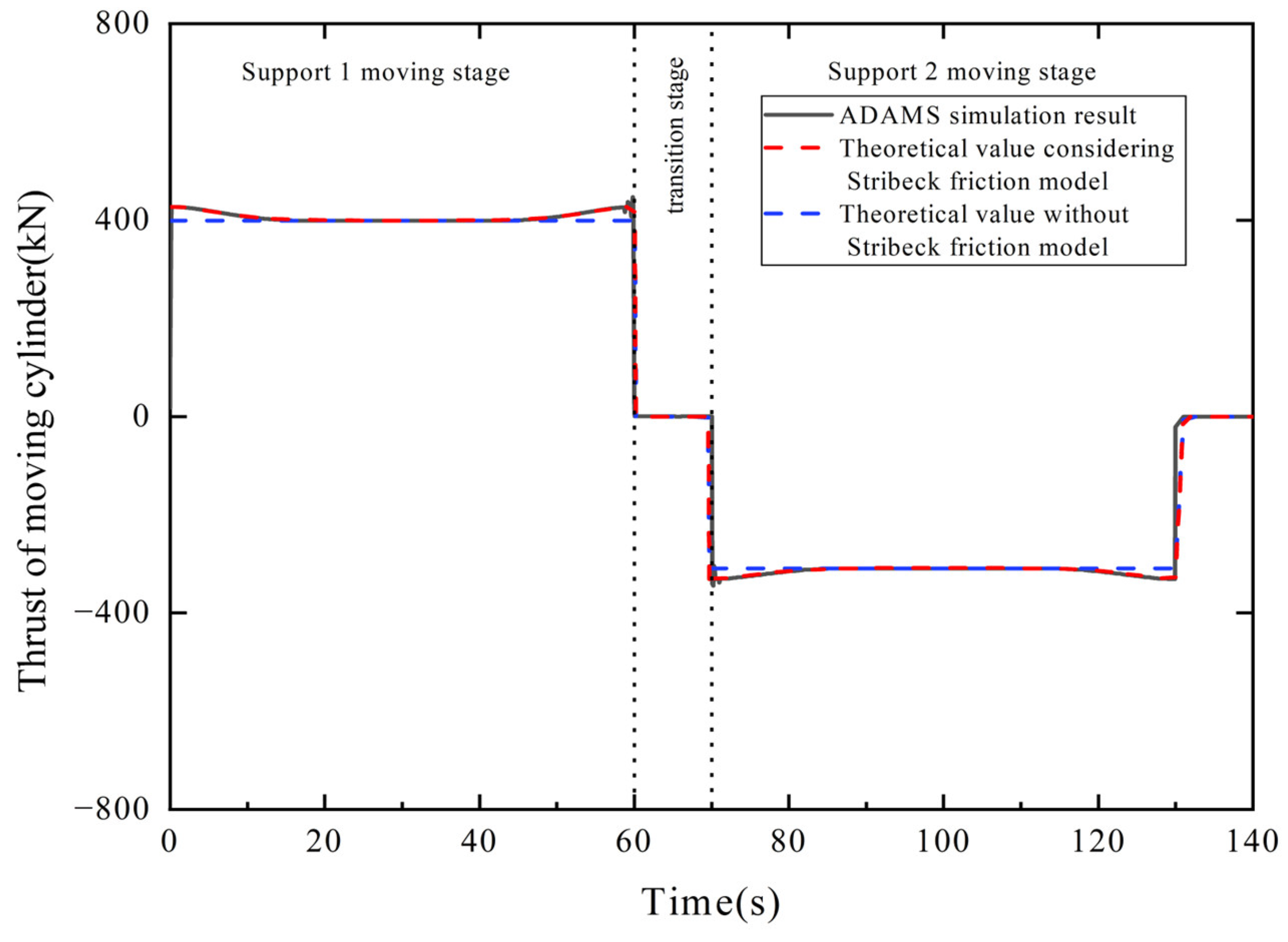 The simulation results show that the theoretical value of the dynamic model of driving under pressure, considering the Stribeck friction theory, has the same trend as the pushing force value of the moving cylinder obtained by the simulation, and its maximum error is 1.3%, which does not exceed 5%. The maximum error between the theoretical value of the driving under pressure dynamic model without considering the Stribeck friction theory and the pushing force value of the moving cylinder obtained by the simulation is 7.8%. Therefore, considering the Stribeck friction theory can make the driving under pressure dynamic model reflect the real values of pushing and pulling force required by support 1 and support 2 during the driving under pressure process of TSR more accurately.