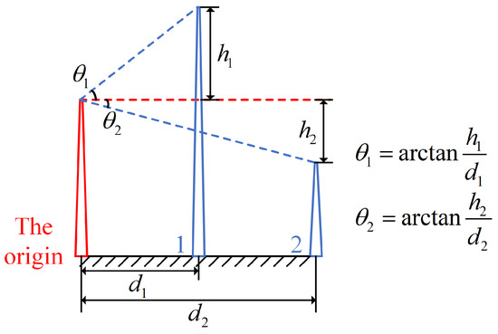 The terrain height angle between two points is caused by the elevation difference between them. As shown in Figure 5, the terrain height angles between points 1, 2, and the origin are and , respectively. We set the elevation difference to be positive when the elevation of other points is greater than that of the origin; it is negative otherwise. As shown in Figure 5, the elevation difference is and , and accordingly, the terrain height angle is and . If the elevations of the two points are equal, the terrain height angle is ; if the elevation difference tends to infinity, such as the cliffs in real life, the terrain height angle is .