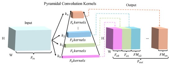 Due to the limited receptive field of a single convolutional kernel, when the feature information in the time-frequency FM is located at the edges, small convolutional kernels are not sufficiently sensitive to edge information, resulting in the loss of edge details. Although large convolutional kernels have a larger receptive field, they require a substantial increase in parameters. As shown in Figure 1, pyramidal convolution (PyConv) comprises convolutional kernel of varying sizes, with the kernel sizes gradually increasing from bottom to top. In addition, PyConv introduces the grouped convolution. The input FMs are then processed through grouped convolution and subsequently fused into a complete output FM along the channel dimension. Compared to atrous spatial pyramid pooling, which utilizes the dilated convolution technique, PyConv offers superior feature capture capabilities and demonstrates better computational efficiency [].