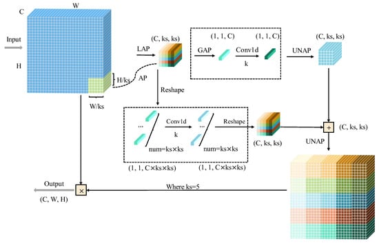 Although attention mechanisms like squeeze-and-excitation (SE) and the convolutional block attention module have shown good performance in many tasks, the mixed local channel attention (MLCA) mechanism excels at capturing high-level feature representations. It offers better adaptability and enables more detailed channelwise feature learning across multiple levels, particularly when handling complex features []. It applies two steps of average pooling (AP) to transform the input feature vectors into a shape of , with the first branch capturing global information and the second branch capturing local spatial information. After one-dimensional convolution, the two one-dimensional vectors are restored to their original resolution through unaverage pooling (UNAP) and the information is then fused to achieve hybrid attention. As shown in Figure 2, Conv1d denotes one-dimensional convolution, and the kernel size of the one-dimensional convolution in MLCA is proportional to the channel , indicating that only the relationship between each channel and its neighboring channels are considered when capturing local cross-channel interaction information. The value of is calculated as in Equation (3).
