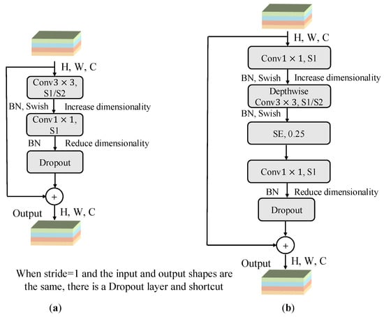 EfficientNetV2-S is structured into seven stages; this is one MBConv stage fewer than the M version, resulting in a significant reduction in the number of parameters. As shown in the Table 1, stage zero consists of a standard convolutional layer. As illustrated in Figure 3a, stages one to three employ the Fused-MBConv layer, which utilizes convolution for channel upscaling, followed by convolution for downscaling. In contrast, stages four to six utilize the MBConv layer, as shown in Figure 3b. It begins by introducing features into a higher-dimensional space through convolution, and this step is followed by feature extraction with a 3 × 3 depthwise convolution. Subsequently, the SE Attention mechanism is applied to capture significant channelwise features. Finally, a 1 × 1 convolution maps the processed features back to the input space. The final stage includes a 1 × 1 convolutional layer, an AP layer, and a fully connected (FC) layer. This streamlined architecture contributes to its reduced parameter count while maintaining efficient performance.