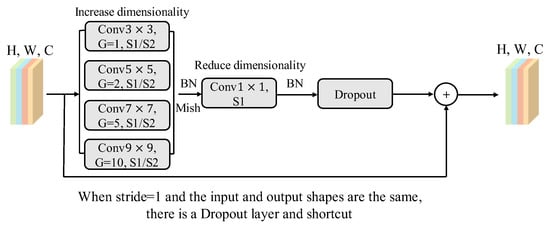 To enlarge the receptive field in the shallow stages and capture multiscale feature information, this study constructed Fused-MBPyConv based on combining Fused-MBConv with PyConv, as shown in Figure 5. When the expansion rate is not 1, Fused-MBPyConv first expands the number of input channels using PyConv. A convolutional kernel of size 1 is then applied to map the expanded features to the desired number of output channels. Finally, the residual connection is introduced to enhance feature representation, prevent information loss, and mitigate the vanishing gradient problem. The specific implementation is given by Equation (5). The input FMs are assumed to be , where , , and denote the channel dimension, height, and width of the input FM, respectively.