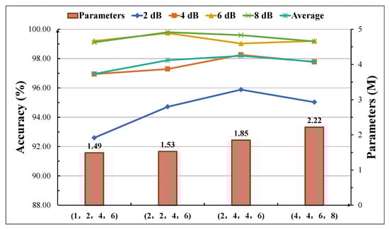 The experimental results are shown in Figure 7. When the noise intensity is low, the accuracy gap is not significant; therefore, the 2 dB experimental results under strong noise interference were selected as the basis for choosing the channel expansion factors. Under 2 dB of noise interference, the model achieves an accuracy of 92.60% when the channel expansion factors for different stages are (1, 2, 4, 6). The model reaches a maximum accuracy of 95.88% when the expansion factors are (2, 4, 4, 6), and this value decreases to 95.03% when the expansion factors are increased to (4, 4, 6, 8). The results indicate that an increase in the channel expansion factors helps the model fuse information from different channels, enabling it to extract diverse features more effectively. However, an excessively high expansion factor can cause the model to converge to a local optimum. Therefore, proper control of the channel expansion factors can help avoid interference from redundant information. In this study, the channel expansion factors(2, 4, 4, 6), which yielded the best diagnostic performance, were selected, and the specific architectural parameters of HFDF-EffNetV2 are shown in Table 3.