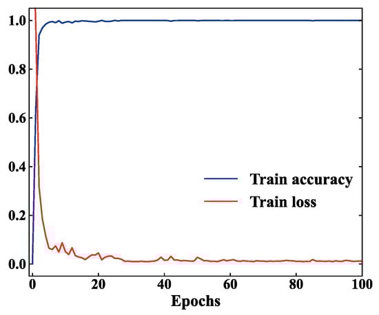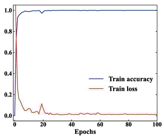The training curves of HFDF-EffNetV2 are shown in Figure 8, where it can be observed that, after a few iterations, the training accuracy reached 100% and the training loss rapidly decreased to around 0.1. Although the loss curve fluctuated several times during the subsequent training, it ultimately converged steadily to 0.011. This indicates that the DAWCE loss function helped the model learn effective fault features, gradually reducing the error and causing it to converge towards optimization.