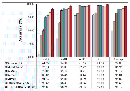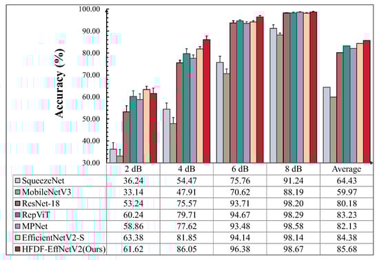 After noise was added, the proposed model achieved an average accuracy of 98.19%, which is 18.39%, 11.23%, 5.07%, 2.38%, 2.37%, and 1.51% higher than the six comparison models. Furthermore, the proposed model performed optimally under the same noise intensity compared to the other models. As the noise intensity increased, the accuracy decreased by only 3.72%, which is 1.05% less than the decrease observed in the next-best model, EfficientNetV2-S. At 2 dB, the accuracies of SqueezeNet and MobileNetV3 dropped dramatically, to 61.77% and 76.14%, respectively; these values were 34.11% and 19.74% lower than that of the proposed model, showing a significant gap. ResNet-18, RepViT, and MPNet performed well at 6 dB and 8 dB but poorly at 2 dB, with their accuracies lower than that of the proposed model by 16.02%, 6.05%, and 4.51%, respectively. EfficientNetV2-S, which had the greatest number of parameters, performs=ed well, though its accuracy was slightly lower than that of the proposed model, by 2.25%, at 2 dB. The results show that there is a relationship between the model’s noise resistance and its parameter count. More importantly, optimizing the model architecture to enhance its feature extraction capabilities can significantly improve the robustness of the model under noise interference.