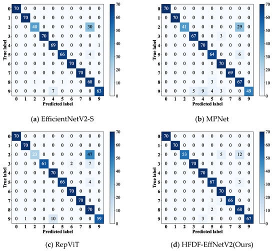 To compare the diagnostic performance of the models under noise interference for different fault types with a simulated SNR of 2 dB, this experiment visualized the confusion matrices of EfficientNetV2-S, RepViT, and MPNet, which performed better in the noise experiments, alongside HFDF-EffNetV2, as shown in Figure 10.
