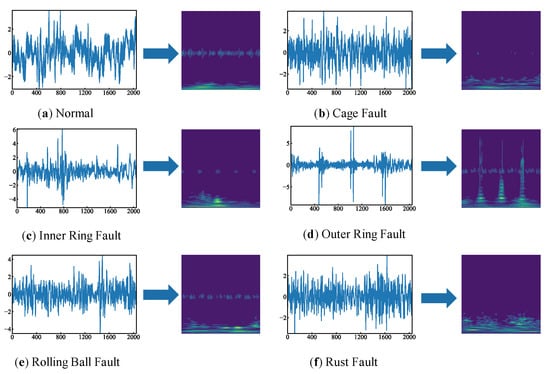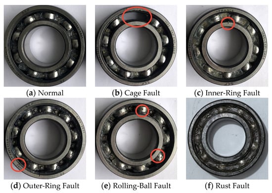 Rolling bearings, which are crucial components of mechanical equipment, are prone to various types of damage due to their long running time and harsh working environment []. If damaged components cannot be detected and replaced promptly, outcomes include disruption of the normal operation of the mechanical equipment, lower production efficiency, and even serious consequences such as substantial economic losses and casualties []. Accurate, real-time detection and diagnosis of the operating condition of rolling bearings is therefore essential [].