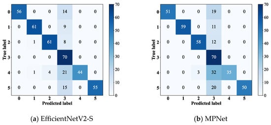 EfficientNetV2 is a lightweight model introduced by Tan et al. [] in 2021 that incorporates the Fused-MBConv and MBConv layers and is available in several versions, including B0~B3, S, and M. The model employs a progressive learning strategy that adaptively adjusts the regularization technique and the input image size, accelerating the training process while maintaining high accuracy. Through neural-architecture search, EfficientNetV2 optimizes three key parameters: input-image resolution, network depth, and channel width. Among the different versions, the M version, with depth and width scaling factors of 1.8 and 1.4, respectively, is suited for high-resolution scenarios, achieving a classification accuracy of 85.1% on the ImageNet dataset. In contrast, the S version, with depth and width scaling factors of 1.2 and 1.1, respectively, focuses more on balancing the number of parameters with accuracy, making it more suitable for lower-resolution applications.