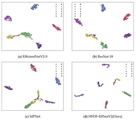 The visualization results are shown in Figure 18. While MPNet and EfficientNetV2-S were effective in clustering and separating the features of fault labels 0, 3, 4, and 5; the clustering and separation of the features for fault labels 1 and 2 were not fully formed, indicating insufficient perception of the differences between fault types, which could result in the misclassification of fault samples. Compared to ResNet-18, the proposed model exhibited more distinct separation for fault labels 1 and 2, with misclassification occurring for only a few samples. The results indicate that HFDF-EffNetV2 effectively establishes a clear classification boundary, demonstrating stronger feature clustering and discriminative ability.