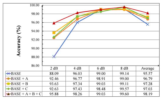 The experimental results are presented in Figure 19 and demonstrate that the application of the three improvement methods significantly enhanced the diagnostic accuracies under strong noise interference. At 2 dB, the accuracy of the BASE + A + B + C was improved by 7.79% compared to the BASE. At 4 dB, BASE + C with the HFDF strategy applied showed improvements of 1.4%, 0.66%, and 0.09% compared to BASE, BASE + A, and BASE + B, respectively. At 6 dB and 8 dB, all models showed improved performance, making the relative improvement of the three enhanced methods compared to BASE non-significant. However, the average accuracies of the three enhanced methods were increased by 1.22%, 1.71%, and 1.46%, respectively, compared to BASE. Overall, all three improvement methods were effective in enhancing the model’s performance under noise interference, with the most significant contributions coming from the application of BSMBConv-MLCA.