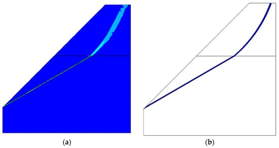 In the second mode of instability, the equivalent plastic strain cloud diagram of the soil–rock binary structure slope is presented in Figure 6a, and the schematic diagram of the sliding surface is shown in Figure 6b. Given that the strength parameter of the soil and the soil–rock contact surface is greater than that of the weak structural surface within the rock body, the slope is destabilized at the weak structural surface, resulting in damage to the upper soil body and the formation of a composite sliding surface comprising a curved sliding surface within the soil body and a straight sliding surface on the weak structural surface. In this case, the traditional limit equilibrium method is unable to determine the location of the sliding surface with sufficient accuracy, thereby preventing an accurate calculation of the safety factor. At this juncture, the lower rock body can be regarded as a deformable body, and a finite element mesh is constructed on it. In this case, the lower rock mass is treated as a deformable body, discretized into a finite element mesh. Stability analyses are conducted using the PFE-IE method proposed by Li [] and the Finite Difference Method (FDM) implemented in the commercial software FLAC. The calculated safety factors are then compared with those obtained from the PRE-IE-FE method. The results of calculating the safety factors using the different methods are presented in Table 4. As can be observed from the table, the calculated safety factor is marginally larger due to PRE-IE-FE’s disregard for the elastic deformation of the lower rock body. Nevertheless, the resulting calculations remain in close proximity to those of PFE-IE and FDM, thereby substantiating PRE-IE-FE’s capacity to accurately analyze the stability of soil–rock binary structure slopes in the second destabilization mode. Additionally, the FLAC calculation for this example required approximately four minutes to complete, given that the PFE-IE method employed a substantial FORTRAN-based program to perform the calculations without utilizing established commercial software. Consequently, a direct comparison of calculation speeds is not feasible. In contrast, the PRE-IE-FE method completed the calculation in less than one minute, which is indicative of the high efficiency of PRE-IE-FE in stability analysis. The aforementioned results demonstrate that PRE-IE-FE is an effective tool for analyzing the stability of soil–rock binary structure slopes in the second destabilization mode. Furthermore, the computational efficiency of PRE-IE-FE is evident, with FLAC requiring approximately four minutes to perform the strength reduction, whereas PRE-IE-FE completed the calculation in less than one minute.