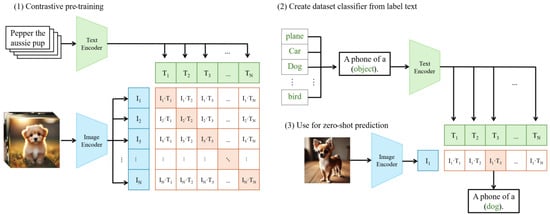 During training, CLIP learns the correspondence between image-text pairs in different batches through contrastive learning [23,24,25,26]. For each image–text pair, the model maximizes the similarity of positive matches while minimizing the similarity of negative matches. This ensures that matching images and texts are mapped to the exact location in the embedding space while non-matching pairs are pushed to different places. This feature enables CLIP to accurately classify images based on textual descriptions in zero-shot learning scenarios, achieving high generalizability.
