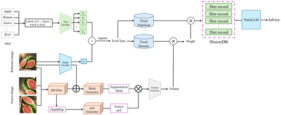 Furthermore, volume plays a critical role in nutritional assessment because it allows consumers to calibrate their nutritional intake through portion sizes and is crucial for improving the accuracy of dietary evaluations. As pointed out by Thames et al. from Google in a 2021 study [6], integrating volume information into neural network-based food nutritional assessment models can significantly enhance the effectiveness and accuracy of the assessment. In terms of volume measurement, this study adopts the E-Volume [7] technique, representing an innovative method that replaces traditional methods of using depth cameras and reference planes [8,9] to estimate food volume. It overcomes the limitations of requiring specialized hardware or portable devices, expands the generality and convenience of the application, and makes volume measurement more accurate and user friendly.