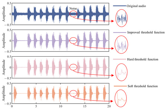 - Fu, R.; Zhang, J.; Wang, R.; Xu, T. Improved Wavelet Thresholding Function and Adaptive Thresholding for Noise Reduction. In Proceedings of the 11th International Conference on Intelligent Computing and Wireless Optical Communications (ICWOC), Chongqing, China, 16–18 June 2023; IEEE: Piscataway, NJ, USA, 2023; pp. 25–30. [Google Scholar]