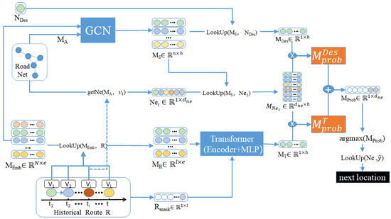 This module predicts the next node from latent representations of the destination node and latent representations of the current route . As shown in Formula (18), latent representations of the destination are looked up from the node representations output with GCN.