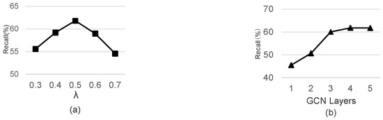 The influence of hyper-parameters on the accuracy of route prediction by RoPT model (Chengdu), where (a) shows the influence of λ value on Recall, and (b) shows the influence of GCN layer number on Recall.