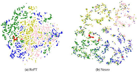 As shown in Figure 3a, the points in these four colors are relatively clustered, where green points are mainly located on the margins of the upper part, yellow points are mostly in the middle, pink points are concentrated in the southwest, and blue points, though more dispersed, can be observed to cluster roughly into two groups in the northeastern and southwestern parts. In contrast, in Figure 3b, the points of different colors are more scattered. The pink points clustered in the north are interspersed with many yellow points, and the blue points clustered in the west are also mixed with a large number of green, yellow, and some red points. Notably, the eastern yellow clusters and southern green clusters both demonstrate pronounced heterogeneity through admixture with other colored points. To further demonstrate the effectiveness of the feature extraction, several consecutive segments of a road are chosen and highlighted in Figure 3a,b. Here, red triangles correspond to several continuous segments on the northern part of the Chengdu Ring Road, which are also circled in the figure. As in Figure 3a, with the latent representations learned with RoPT, these segments are clustered closely on the right side of the figure. Conversely, Neuro’s representations result in the significant dispersion of these segments. Especially, the segment located in the leftmost circle in Figure 3b is far away from the other segments. This phenomenon demonstrates that RoPT is more effective in capturing the correlations between nodes in the road network.