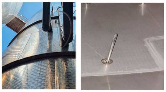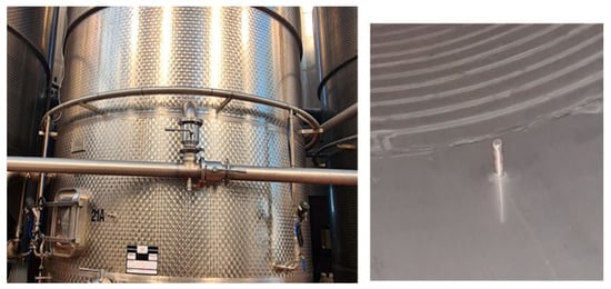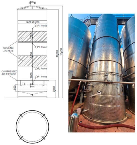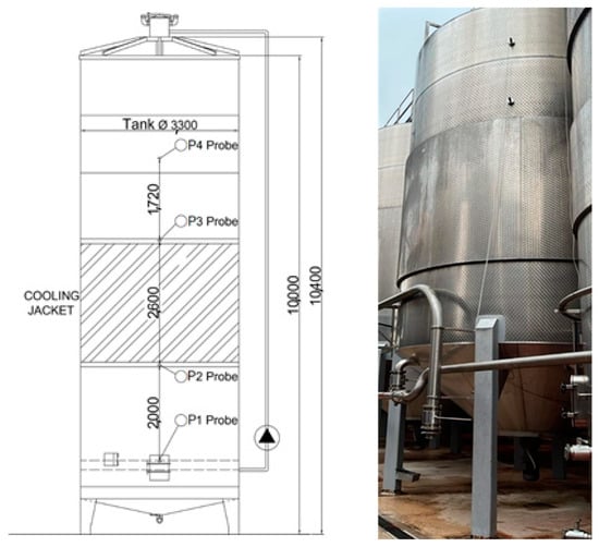 Each fermenter was equipped with four temperature probes at different heights: probe P1 at 1.5 m from the bottom (Figure 2 and Figure 3); probe P2 at 3.6 m from the bottom, located under the cooling jacket in fermenter A11 (Figure 2) and under the lower cooling jacket in fermenter A21 (Figure 3); probe P3 at 5.4 m from the bottom, located above the cooling jacket in fermenter A11 (Figure 2) and under the upper cooling jacket in fermenter A21 (Figure 3); and probe P4 at 8.2 m from the bottom, immersed in the grape cap (Figure 6).