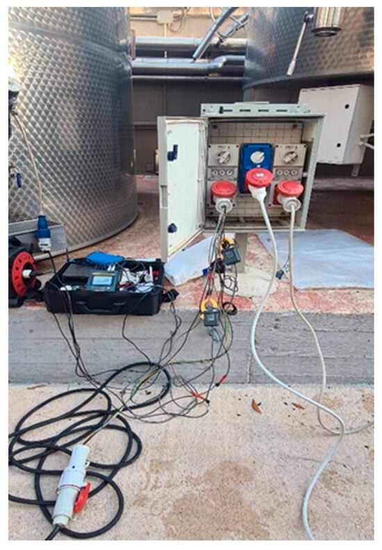 To measure the active electrical power absorbed by the motors of the machines, a Power Quality Meter & Analyzer with data logger function (YOKOGAWA, model CW121) was used. This instrument allows the measurement of energy consumption for both single-phase and three-phase loads, considering the potential load imbalance on each phase. The measurements were conducted by inserting the instrument’s connections into the electrical line between the control panel and the motor of the target machine (Figure 7), while also recording the actual operating time.