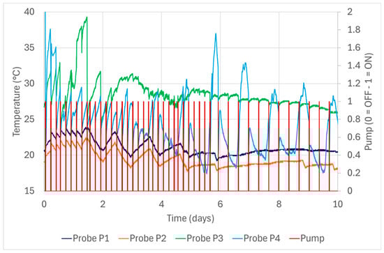 Figure 8 and Figure 9 illustrate the temporal trends of temperatures at different measurement points for the fermenter equipped with the traditional pumping-over system and the fermenter with the AMI system, respectively, along with the intervention times of the pump–diffuser unit. In both cases, probes P1, P2, and P4 are positioned at the must sampling/injection point, at the lowest point of the cooling jackets, and in the cap of grape marc, respectively, while probe P3 is located at the height of the cooling jackets, specifically at the highest point of the cooling jacket in tank A11 (traditional system) and at the lowest point of the second (upper) cooling jacket in tank A21 (AMI system).