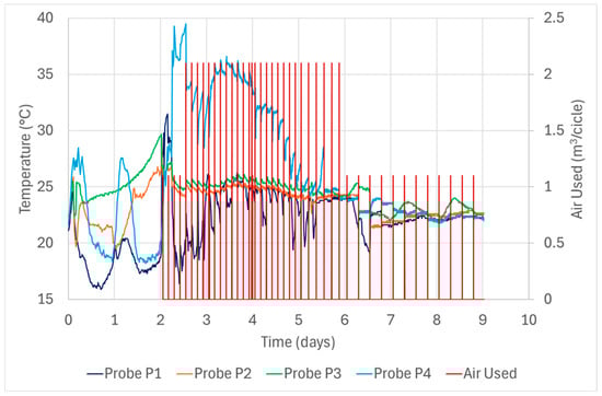 During the first four days of operation of the AMI system, only the must temperature at the bottom of the fermentation tank exhibited wider fluctuations, within the range of 17–25 °C (Figure 9), likely due to the short interval of only 3 h between successive interventions. In contrast, during the last three days of fermentation, the interval was extended to 6 h, which is still more frequent than in the final days of the process using the traditional system. In this case, only minor temperature fluctuations were observed during this final phase, always with a slight temperature reduction coinciding with each intervention of the Air-Modulated Injection System, but significantly lower than the fluctuations recorded with the traditional system.