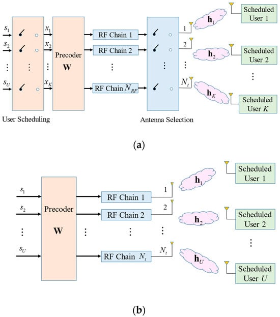 14]. In contrast, joint optimization can more effectively exploit spatial resources by selecting the optimal subsets of users and antennas under limited resources (e.g., RF chains, transmit power), thereby maximizing the system’s sum rate.