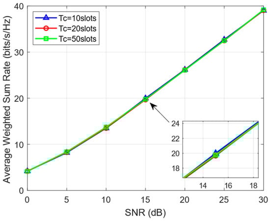In addition, when a user is always scheduled to participate in communication, its average rate will keep increasing. According to the expression of user weight, with the increase in average rate, the user weight will decrease, which means that the user is less important. On the other hand, if a user is not always scheduled, its average rate will keep decreasing and the corresponding weight will increase, which improves the importance of the user and increases the possibility that he is scheduled. Therefore, by adaptively adjusting the user weight, more users can be scheduled to participate in communication.