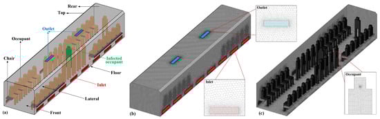 The geometry and mesh of the different ventilation methods (MV and SFRC) inside the subway carriage are shown in Figure 2 and Figure 3. A hexahedral mesh was used for the simulation. The physical model of the subway carriage was established according to the national standard “Subway Design Code” (GB 50157-2013) [33]. The dimensions of the car were 12.8 m (X) × 2.5 m (Y) × 2.1 m (Z). The carriage contained 36 passengers (according to the GB 50157-2013 standard, a typical case with 36 seated passengers was selected), one of whom was considered infected. The height of the infected passenger was 1.7 m, and the mouth of each individual was modeled as a circular opening. Table 1 contains the inlet and outlet information (size and quantity), as well as the mesh numbers for both ventilation methods.