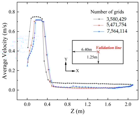 Local mesh refinement is necessary to examine how gradient changes influence factors such as velocity, temperature, concentration, and others. The facial area near the patient’s mouth was refined to a size of 5 mm. Ten prism layers were applied to the patient’s skin, with the first layer having a thickness of 0.5 mm. Additionally, three expanding boundary layers were applied to each surface of the subway car to ensure sufficient mesh refinement. The Grid Convergence Index (GCI) was used to verify mesh independence. In conformity with the y+ range, we use the k-epsilon model to be able to improve the accuracy for the calculation. Three different mesh resolutions were used for each computational model. Specifically, coarse (3,580,429 cells), medium (5,471,754 cells), and fine (7,564,114 cells) meshes were used, with varying surface and volume mesh sizes. The velocity along the validation line (X = 6.4 m, Y = 1.25 m, Z = 0–2.1 m) differed by less than 5% when compared with the results using the fine mesh (7,564,114 cells). The results of the mesh independence verification analysis are shown in Figure 4. A mesh model consisting of 5,471,754 cells was selected for the simulations, balancing computational accuracy with the available resources of the computer system used in this paper. The maximum length of the volume mesh was 90 mm, while the surface mesh sizes for the model, air supply and exhaust surfaces, wall surfaces, and the passengers’ mouths were 12.5 mm, 15 mm, 85 mm, and 4 mm, respectively.