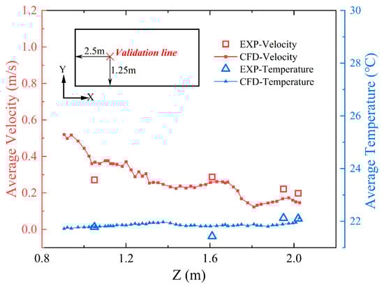 The numerical model leverages the experimental data set supplied by Chen [38] to recreate the experimental conditions. In the simulation, the air supply velocity under the MV mode is 1.6 m/s, and under the SFRC mode, the air supply velocities, consistent with this study, are 0.2 m/s, 0.3 m/s, and 0.4 m/s, with all temperatures set at 293 K. Figure 5 shows a comparison between the simulated velocity and temperature fields and the experimental results. The experimental and modeling results show that the velocity and temperature distributions along the Z-axis are consistent, with maximum errors of 26% for wind speed and 2.3% for temperature. In the experiment, potential movement of passengers in the subway carriage could have influenced the discrepancies between the experimental and simulation results. Therefore, this study assumes that passengers remain stationary in the simulation.