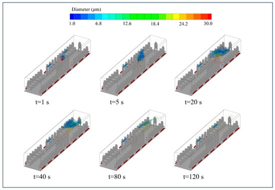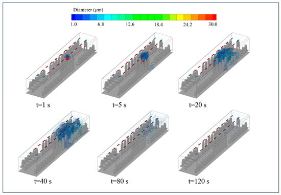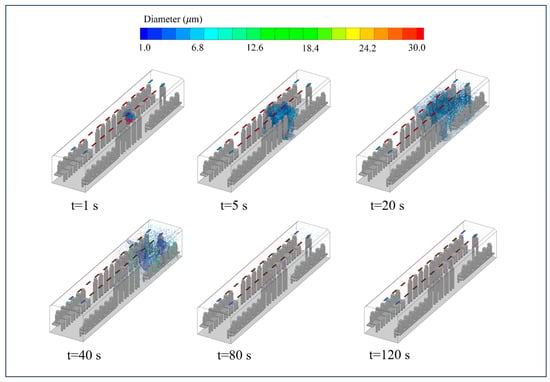 Compared to the MV system, the SFRC method has a stronger ventilation effect, with a more distinctive distribution of droplets. Figure 8 illustrates the droplet nucleus distribution in Case 1, where the air supply velocity of the SFRC system is 0.2 m/s. Notably, at t = 5 s, the droplets move more quickly towards the return air vents, with droplets larger than 30 µm disappearing. Due to evaporation, most droplets shrink to nuclei smaller than 15 µm, rising due to the combined effects of exhaled airflow and thermal plume, then spreading out upon nearing the ceiling. Under the influence of the SFRC system, the diffused droplet nuclei quickly gather near the return air vents. At t = 80 s, most droplets in the carriage have been cleared, and droplet nuclei are more uniform. This contrasts sharply with Case 4 and Case 6, demonstrating the superiority of ceiling return air in removing contaminants (as can also be observed from the diffusion range of the tracer gas).
