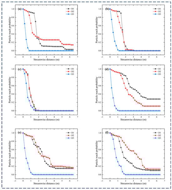 Although the situations of the two ventilation systems differ slightly, this trend is consistently observed across the six examples. Another extreme is that, at different air supply speeds, the largest particles in diameter distribution for both ventilation methods settle at distances of less than 2 m from the ground. Regarding Figure 10, in the MV system (d)–(f), neither intermediate nor smaller diameter particles exhibit a tendency to settle at close distances, and the flow distances are significantly greater than those in the SFRC system. The overall trend of PRP variations for different particle sizes remains unchanged; however, within the social safety distance of 2–3 m, both intermediate and small diameter particles show a higher probability of reaching their destination, with no significant differences in the sedimentation distances of the final particles in the distribution.