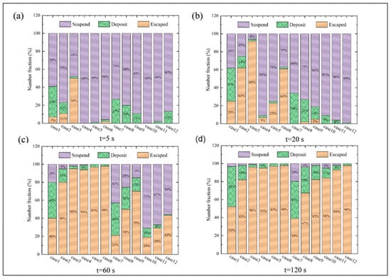 Distribution of droplet nuclei: suspension, escape, deposition, and (a) number fraction of droplet nuclei at 5 s; (b) number fraction of droplet nuclei at 20 s; (c) number fraction of droplet nuclei at 60 s; (d) number fraction of droplet nuclei at 120 s.